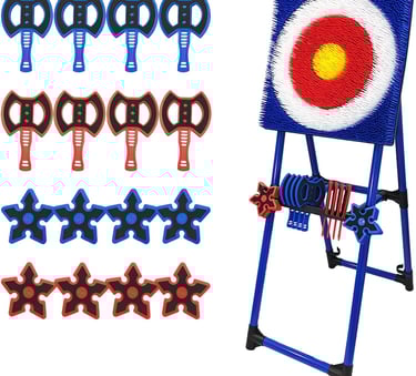 This complete backyard axe-throwing game set delivers safe, competitive fun for families and friends with a sturdy foldable target stand and 16 throwing pieces. Built with thick metal tubes for stability, it includes 8 EVA throwing axes and 8 throwing stars designed for exciting play without sharp edges. The large target board allows multiple players to compete at once, while the adjustable distance makes it perfect for both indoor and outdoor setups. Easy to assemble and store, this game turns any yard, party, or gathering into an action-packed challenge for all ages.