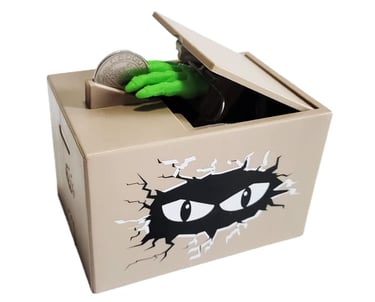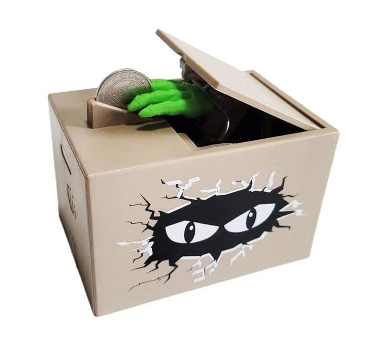 The NEXTAKE Ghost Hand Piggy Bank is a fun and surprising money-saving toy that adds excitement to every coin you drop. Simply place a coin in the slot, and the box will shake before a spooky ghost hand suddenly appears and grabs the coin, pulling it inside the bank. Made from durable ABS plastic with built-in electronic components, it creates a playful prank effect that kids and adults both enjoy. The compact design fits easily on desks, shelves, or nightstands, making it both a toy and a decorative piece. Powered by two AA batteries, it turns saving money into an entertaining experience that encourages kids to build the habit of saving while having fun.