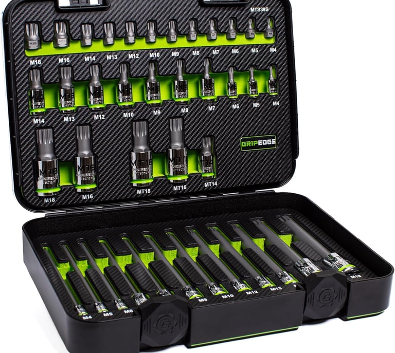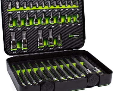 Take on demanding automotive and industrial jobs with the GripEdge 39-PC RPT Triple Square Master Bit Socket Set. Designed with patented Rounding Prevention Technology (RPT), this professional-grade set delivers up to 50% more grip on new fasteners and up to 400% more grip on damaged ones compared to standard tools. The kit includes low-profile, standard, extra-long 6-inch, and security (tamper-proof) triple square bit sockets, covering sizes M4 through M18 for maximum versatility. Precision-machined from high-strength S2 steel with a corrosion-resistant coating, each bit ensures durability, torque control, and long service life. Multiple drive options (1/4", 3/8", and 1/2") provide compatibility with standard ratchets and wrenches. All 39 pieces are organized in a premium molded case with EVA foam insert for quick identification and secure transport. Built for professionals who demand reliability, access, and performance in one complete master set.