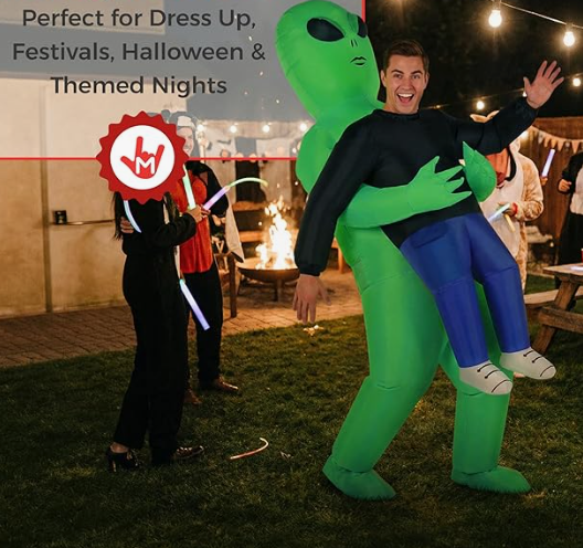 Turn heads and make everyone laugh with this hilarious inflatable alien abduction costume. Designed with a built-in fan that inflates the suit in about 60 seconds, it creates the funny illusion that an alien is carrying you away. Lightweight polyester fabric keeps it comfortable while allowing easy movement during parties, Halloween events, or cosplay gatherings.