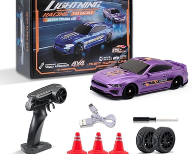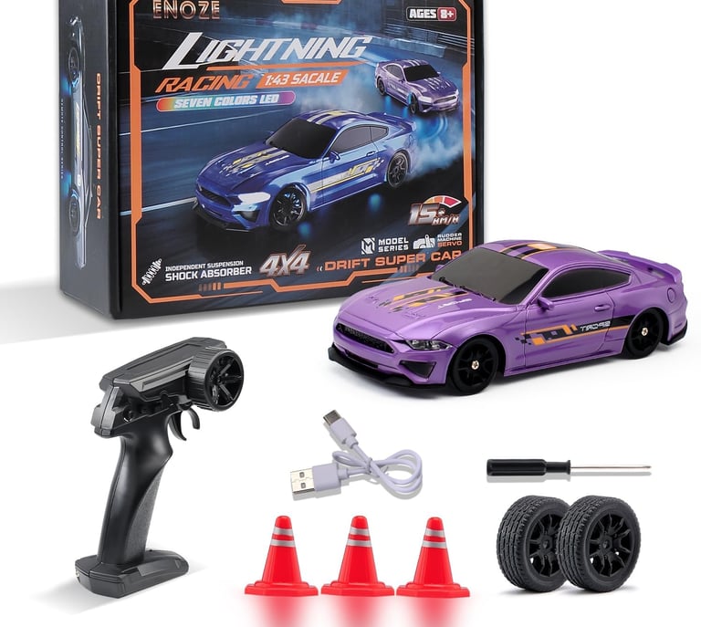 This 1:43 scale mini drift racing car delivers high-speed 4WD performance in a compact, desk-friendly size. Powered by a 2.4GHz full-proportional control system, it moves forward, backward, brakes, and turns with smooth precision up to 15KM/H. The bright LED lights add a realistic racing vibe, while the included drift and grip tires let you switch between sliding action and tighter control. With Type-C charging, a 100mAh battery, and up to 30 minutes of playtime, it’s ready for indoor or outdoor fun. Small enough to take anywhere, yet powerful enough to thrill, it’s the perfect hobby gift for kids and adults alike.