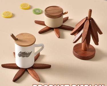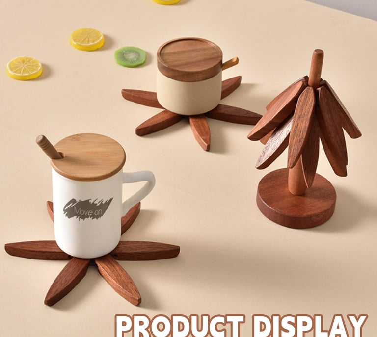Add style and functionality to your kitchen with this unique tree-shaped wooden trivet set. Designed with 4 foldable walnut wood trivets and a sleek stand, it protects your surfaces from hot dishes while doubling as an elegant decorative piece when not in use.