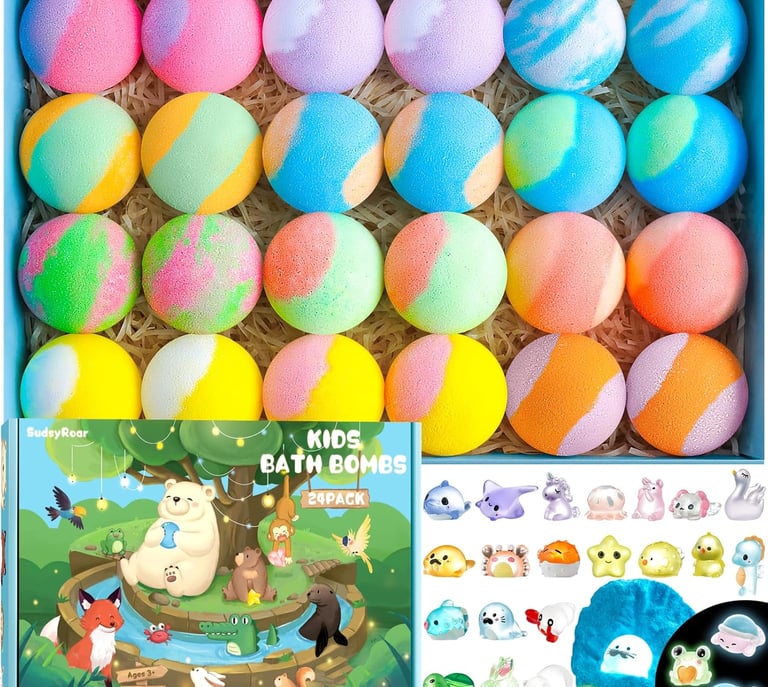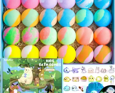 Make bath time the best part of your child’s day with this fun 24-pack bath bomb set filled with hidden surprises. Each bath bomb fizzes into vibrant colors and pleasant scents, revealing unique glow-in-the-dark toys that keep kids excited and engaged.