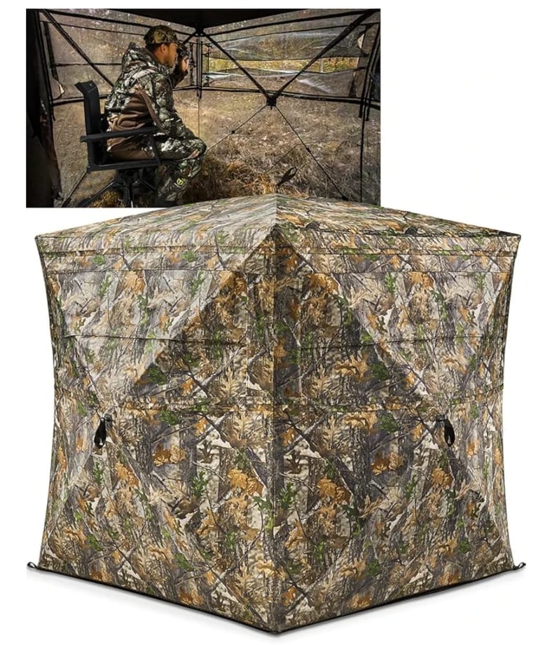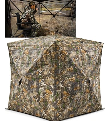 The TIDEWE Hunting Blind offers a 270° see-through design, giving hunters a wide, clear view while staying hidden in camouflage. Its pop-up structure makes setup fast and easy, while the durable, weather-resistant build ensures reliable use outdoors. With multiple size options (1-2, 2-3, or 3-4 persons), it’s perfect for solo or group hunting trips. Lightweight and portable with a carrying bag, this ground blind is ideal for deer, turkey, or other game hunting.